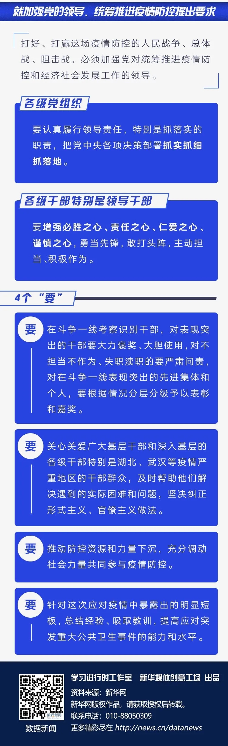 習(xí)近平指出,打好、打贏這場疫情防控的人民戰(zhàn)爭、總體戰(zhàn)、阻擊戰(zhàn),必須加強(qiáng)黨對(duì)統(tǒng)籌推進(jìn)疫情防控和經(jīng)濟(jì)社會(huì)發(fā)展工作的領(lǐng)導(dǎo)。各級(jí)黨組織要認(rèn)真履行領(lǐng)導(dǎo)責(zé)任,特別是抓落實(shí)的職責(zé),把黨中央各項(xiàng)決策部署抓實(shí)抓細(xì)抓落地。各級(jí)干部特別是領(lǐng)導(dǎo)干部要增強(qiáng)必勝之心、責(zé)任之心、仁愛之心、謹(jǐn)慎之心,勇當(dāng)先鋒,敢打頭陣,主動(dòng)擔(dān)當(dāng)、積極作為。要在斗爭一線考察識(shí)別干部,對(duì)表現(xiàn)突出的干部要大力褒獎(jiǎng)、大膽使用,對(duì)不擔(dān)當(dāng)不作為、失職瀆職的要嚴(yán)肅問責(zé),對(duì)在斗爭一線表現(xiàn)突出的先進(jìn)集體和個(gè)人,要根據(jù)情況分層分級(jí)予以表彰和嘉獎(jiǎng)。要關(guān)心關(guān)愛廣大基層干部和深入基層的各級(jí)干部特別是湖北、武漢等疫情嚴(yán)重地區(qū)的干部群眾,及時(shí)幫助他們解決遇到的實(shí)際困難和問題,堅(jiān)決糾正形式主義、官僚主義做法。要推動(dòng)防控資源和力量下沉,充分調(diào)動(dòng)社會(huì)力量共同參與疫情防控。要針對(duì)這次應(yīng)對(duì)疫情中暴露出的明顯短板,總結(jié)經(jīng)驗(yàn)、吸取教訓(xùn),提高應(yīng)對(duì)突發(fā)重大公共衛(wèi)生事件的能力和水平。