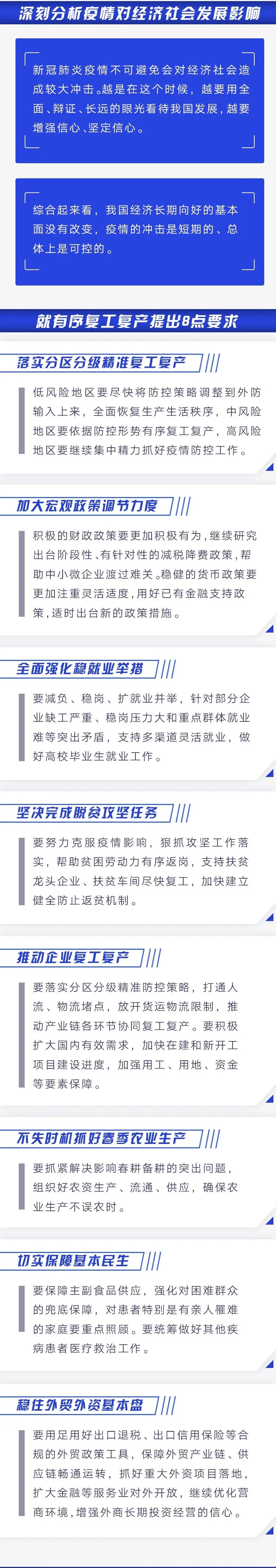 習(xí)近平指出,新冠肺炎疫情不可避免會(huì)對(duì)經(jīng)濟(jì)社會(huì)造成較大沖擊。越是在這個(gè)時(shí)候,越要用全面、辯證、長遠(yuǎn)的眼光看待我國發(fā)展,越要增強(qiáng)信心、堅(jiān)定信心。綜合起來看,我國經(jīng)濟(jì)長期向好的基本面沒有改變,疫情的沖擊是短期的、總體上是可控的。習(xí)近平就有序復(fù)工復(fù)產(chǎn)提出8點(diǎn)要求。第一,落實(shí)分區(qū)分級(jí)精準(zhǔn)復(fù)工復(fù)產(chǎn)。低風(fēng)險(xiǎn)地區(qū)要盡快將防控策略調(diào)整到外防輸入上來,全面恢復(fù)生產(chǎn)生活秩序,中風(fēng)險(xiǎn)地區(qū)要依據(jù)防控形勢有序復(fù)工復(fù)產(chǎn),高風(fēng)險(xiǎn)地區(qū)要繼續(xù)集中精力抓好疫情防控工作。第二,加大宏觀政策調(diào)節(jié)力度。積極的財(cái)政政策要更加積極有為,繼續(xù)研究出臺(tái)階段性、有針對(duì)性的減稅降費(fèi)政策,幫助中小微企業(yè)渡過難關(guān)。穩(wěn)健的貨幣政策要更加注重靈活適度,用好已有金融支持政策,適時(shí)出臺(tái)新的政策措施。第三,全面強(qiáng)化穩(wěn)就業(yè)舉措。要減負(fù)、穩(wěn)崗、擴(kuò)就業(yè)并舉,針對(duì)部分企業(yè)缺工嚴(yán)重、穩(wěn)崗壓力大和重點(diǎn)群體就業(yè)難等突出矛盾,支持多渠道靈活就業(yè),做好高校畢業(yè)生就業(yè)工作。第四,堅(jiān)決完成脫貧攻堅(jiān)任務(wù)。要努力克服疫情影響,狠抓攻堅(jiān)工作落實(shí),幫助貧困勞動(dòng)力有序返崗,支持扶貧龍頭企業(yè)、扶貧車間盡快復(fù)工,加快建立健全防止返貧機(jī)制。第五,推動(dòng)企業(yè)復(fù)工復(fù)產(chǎn)。要落實(shí)分區(qū)分級(jí)精準(zhǔn)防控策略,打通人流、物流堵點(diǎn),放開貨運(yùn)物流限制,推動(dòng)產(chǎn)業(yè)鏈各環(huán)節(jié)協(xié)同復(fù)工復(fù)產(chǎn)。要積極擴(kuò)大國內(nèi)有效需求,加快在建和新開工項(xiàng)目建設(shè)進(jìn)度,加強(qiáng)用工、用地、資金等要素保障。第六,不失時(shí)機(jī)抓好春季農(nóng)業(yè)生產(chǎn)。要抓緊解決影響春耕備耕的突出問題,組織好農(nóng)資生產(chǎn)、流通、供應(yīng),確保農(nóng)業(yè)生產(chǎn)不誤農(nóng)時(shí)。第七,切實(shí)保障基本民生。要保障主副食品供應(yīng),強(qiáng)化對(duì)困難群眾的兜底保障,對(duì)患者特別是有親人罹難的家庭要重點(diǎn)照顧。要統(tǒng)籌做好其他疾病患者醫(yī)療救治工作。第八,穩(wěn)住外貿(mào)外資基本盤。要用足用好出口退稅、出口信用保險(xiǎn)等合規(guī)的外貿(mào)政策工具,保障外貿(mào)產(chǎn)業(yè)鏈、供應(yīng)鏈暢通運(yùn)轉(zhuǎn),抓好重大外資項(xiàng)目落地,擴(kuò)大金融等服務(wù)業(yè)對(duì)外開放,繼續(xù)優(yōu)化營商環(huán)境,增強(qiáng)外商長期投資經(jīng)營的信心。