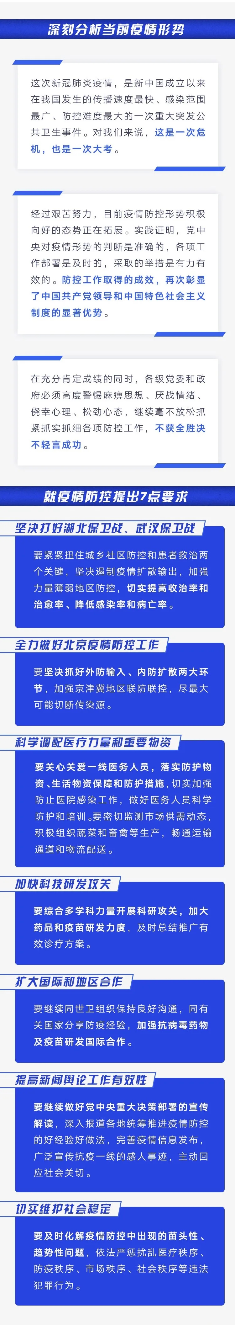 習(xí)近平強(qiáng)調(diào),在充分肯定成績的同時(shí),各級(jí)黨委和政府必須高度警惕麻痹思想、厭戰(zhàn)情緒、僥幸心理、松勁心態(tài),繼續(xù)毫不放松抓緊抓實(shí)抓細(xì)各項(xiàng)防控工作,不獲全勝?zèng)Q不輕言成功。習(xí)近平提出7點(diǎn)要求。第一,堅(jiān)決打好湖北保衛(wèi)戰(zhàn)、武漢保衛(wèi)戰(zhàn)。要緊緊扭住城鄉(xiāng)社區(qū)防控和患者救治兩個(gè)關(guān)鍵,堅(jiān)決遏制疫情擴(kuò)散輸出,加強(qiáng)力量薄弱地區(qū)防控,切實(shí)提高收治率和治愈率、降低感染率和病亡率。第二,全力做好北京疫情防控工作。要堅(jiān)決抓好外防輸入、內(nèi)防擴(kuò)散兩大環(huán)節(jié),加強(qiáng)京津冀地區(qū)聯(lián)防聯(lián)控,盡最大可能切斷傳染源。第三,科學(xué)調(diào)配醫(yī)療力量和重要物資。要關(guān)心關(guān)愛一線醫(yī)務(wù)人員,落實(shí)防護(hù)物資、生活物資保障和防護(hù)措施,切實(shí)加強(qiáng)防止醫(yī)院感染工作,做好醫(yī)務(wù)人員科學(xué)防護(hù)和培訓(xùn)。要密切監(jiān)測市場供需動(dòng)態(tài),積極組織蔬菜和畜禽等生產(chǎn),暢通運(yùn)輸通道和物流配送。第四,加快科技研發(fā)攻關(guān)。要綜合多學(xué)科力量開展科研攻關(guān),加大藥品和疫苗研發(fā)力度,及時(shí)總結(jié)推廣有效診療方案。第五,擴(kuò)大國際和地區(qū)合作。要繼續(xù)同世衛(wèi)組織保持良好溝通,同有關(guān)國家分享防疫經(jīng)驗(yàn),加強(qiáng)抗病毒藥物及疫苗研發(fā)國際合作。第六,提高新聞輿論工作有效性。要繼續(xù)做好黨中央重大決策部署的宣傳解讀,深入報(bào)道各地統(tǒng)籌推進(jìn)疫情防控的好經(jīng)驗(yàn)好做法,完善疫情信息發(fā)布,廣泛宣傳抗疫一線的感人事跡,主動(dòng)回應(yīng)社會(huì)關(guān)切。第七,切實(shí)維護(hù)社會(huì)穩(wěn)定。要及時(shí)化解疫情防控中出現(xiàn)的苗頭性、趨勢性問題,依法嚴(yán)懲擾亂醫(yī)療秩序、防疫秩序、市場秩序、社會(huì)秩序等違法犯罪行為。