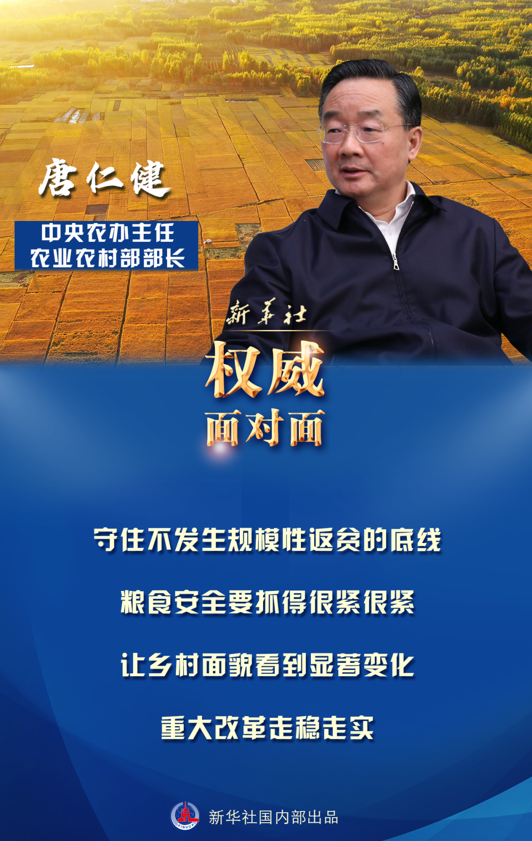 唐仁健:脫貧摘帽不是終點(diǎn),而是新生活、新奮斗的起點(diǎn)。鞏固拓展脫貧攻堅(jiān)成果,做好同鄉(xiāng)村振興有效銜接,是今年和“十四五”時(shí)期“三農(nóng)”工作最重要任務(wù)。
