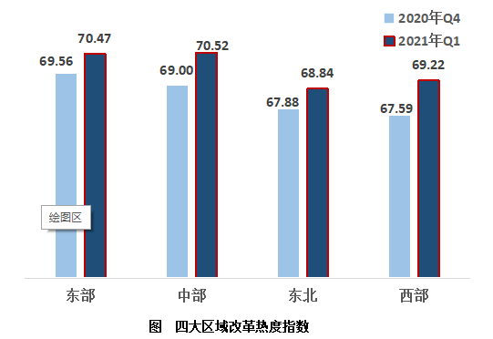 2、中西部地區(qū)引領(lǐng)指數(shù)回升趨勢。從四大區(qū)域來看,東部、中部、東北、西部的改革熱度指數(shù)分別為70.47,70.52,68.84,69.22;中、西部地區(qū)指數(shù)增幅超越東部。從排名來看,中部地區(qū)超越東部地區(qū),名列第一;西部地區(qū)小幅超越東北地區(qū)位居第三,東北地區(qū)墊底。