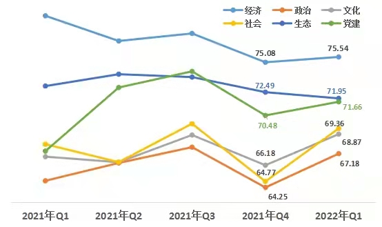 1、從領(lǐng)域來看,經(jīng)濟領(lǐng)域增幅低于其他領(lǐng)域。第一季度,經(jīng)濟領(lǐng)域得分75.54,政治領(lǐng)域得分67.18 ,文化領(lǐng)域得分68.87,社會領(lǐng)域得分69.36,生態(tài)領(lǐng)域得分71.95,黨建領(lǐng)域得分71.66。與上一季度相比,生態(tài)領(lǐng)域小幅下降,其他五個領(lǐng)域均上升。其中社會領(lǐng)域升幅最大,政治領(lǐng)域次之,經(jīng)濟領(lǐng)域提升最小。