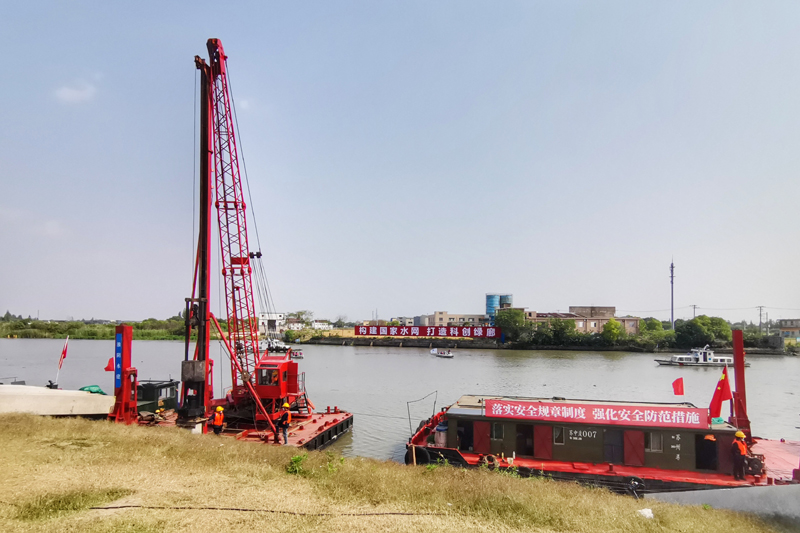 5月16日,在蘇州昆山的吳淞江整治工程施工現(xiàn)場,工程船舶整裝待發(fā)(手機拍攝)。新華社發(fā)