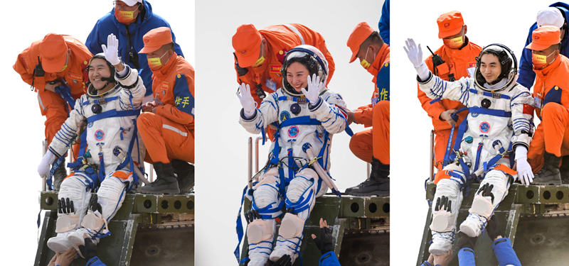 4月16日,神舟十三號載人飛船返回艙在東風(fēng)著陸場成功著陸。這是航天員翟志剛、王亞平、葉光富(左至右)安全順利出艙(拼版照片)。新華社發(fā)