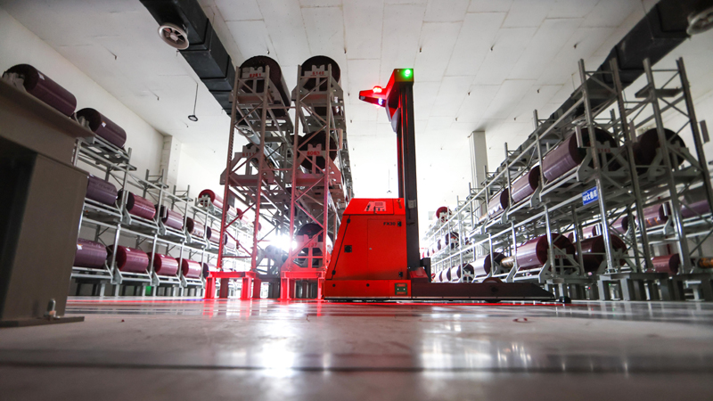 5月17日,AGV(自動導(dǎo)引運輸車)穿行在貴州首個5G全連接工廠的部件生產(chǎn)區(qū)內(nèi)。新華社記者 歐東衢 攝