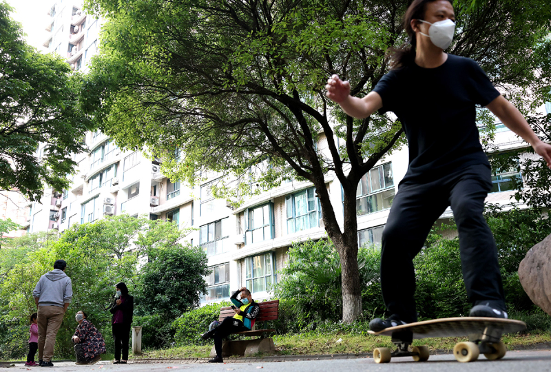 5月17日,市民在上海市普陀區(qū)的一個居民小區(qū)內(nèi)享受休閑一刻。新華社記者 陳飛 攝