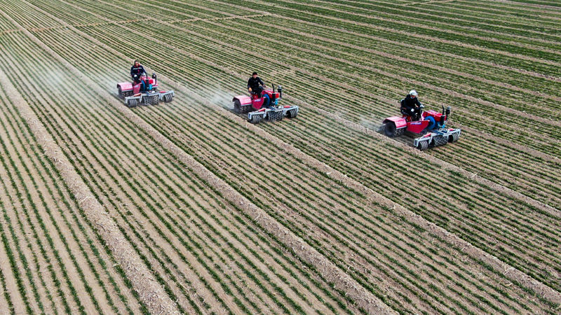 2月17日,在山東省聊城市莘縣妹冢鎮(zhèn),農(nóng)民在麥田里進行鎮(zhèn)壓保墑作業(yè)(無人機照片)。新華社記者 郭緒雷 攝