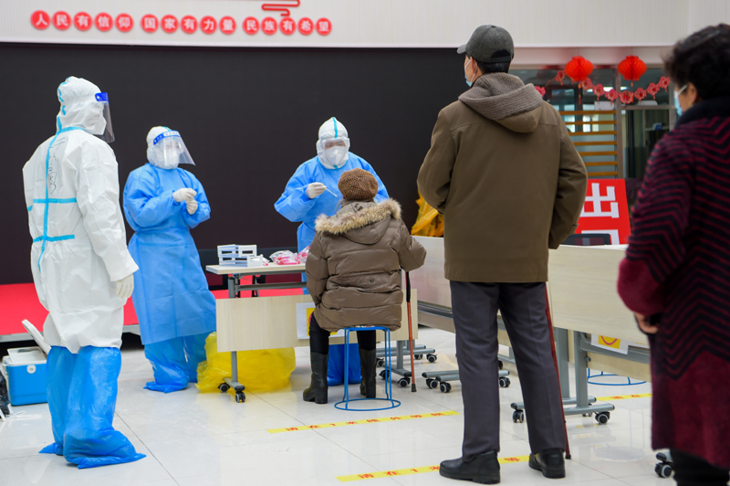 在內(nèi)蒙古滿洲里市東山街道辦事處怡園社區(qū)府欣小區(qū)A區(qū)核酸采樣點,工作人員為居民做核酸采樣(2021年11月29日攝)。新華社記者 李志鵬 攝