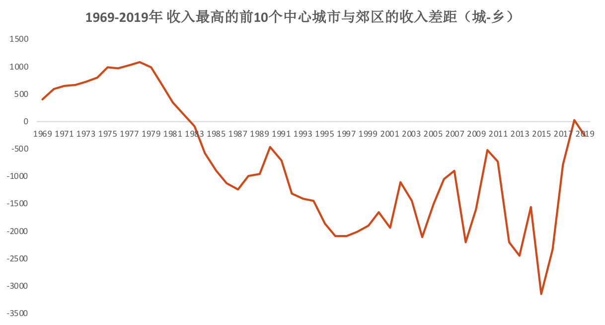 圖2:美國城鄉(xiāng)融合的表現(xiàn)-中心城區(qū)與郊區(qū)的收入差距扭轉
