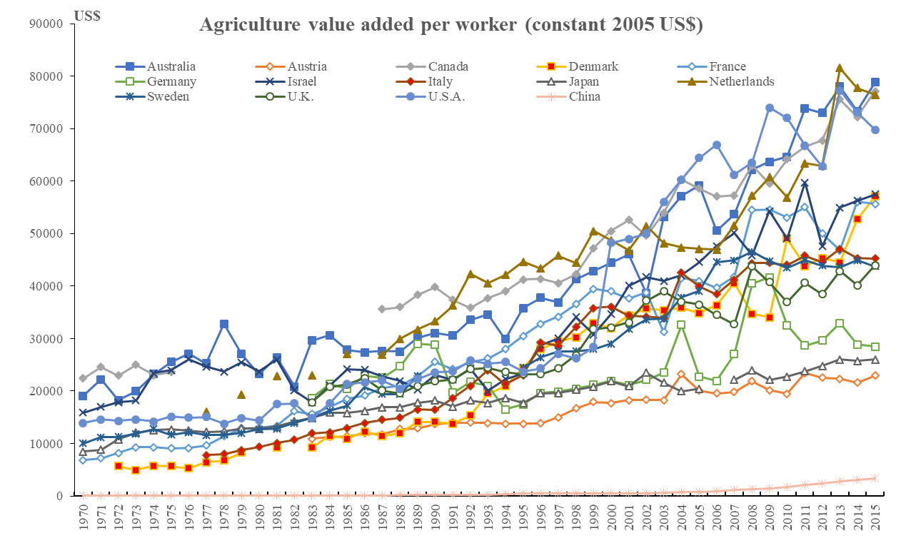 如圖5,西方城市化過程中兩個收入差距的縮小在中國沒有出現(xiàn)。中國在最快速城市化階段出現(xiàn)了城鄉(xiāng)收入差距拉大,第一是我們只有快速城市化,但沒有城鄉(xiāng)融合。第二是我們城市化的模式是回村的城市化模式。在城市里干工作,干到一定程度再回到農村,這是全世界沒有的。第三是農業(yè)競爭力下降?,F(xiàn)在一定要有一個認識,農業(yè)的份額降到10%以后,各個國家的農業(yè)到底在干什么?我們現(xiàn)在想到農業(yè)到10%,再到2%、1%,農業(yè)就可有可無了,這種觀點是錯誤的。所有國家的農業(yè)在降到10%以后,農業(yè)在變強,它的農業(yè)和原來的農業(yè)完全不一樣。中國由于單向城市化的模式,最后農業(yè)競爭力進一步下降。(如圖6)我們現(xiàn)在只有6%、7%的農業(yè),這個農業(yè)的競爭力是下降的,背后是農業(yè)成本上升,所有成本都在上升。