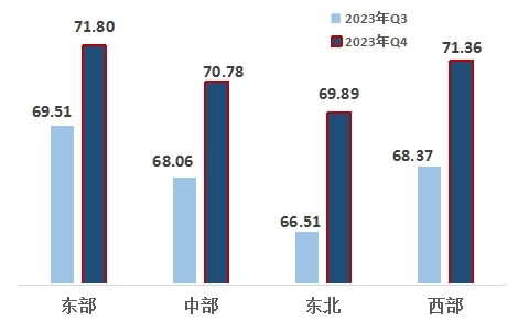 從四大區(qū)域來看,東部、中部、東北、西部地區(qū)指數(shù)分別為71.80、70.78、69.89、71.36。四大區(qū)域排名與上一季度沒有變化,改革熱度指數(shù)均有上升,東北地區(qū)提升幅度最大。