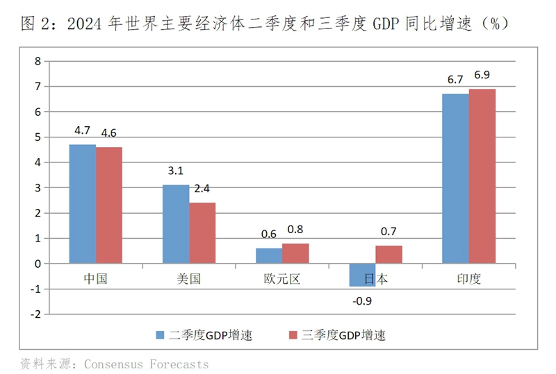 Consensus Forecasts 9月份最新預(yù)測(cè),世界主要經(jīng)濟(jì)體GDP增速有升有落,呈現(xiàn)出走勢(shì)分化的特征。三季度美國GDP同比增長(zhǎng)2.4%,比二季度增長(zhǎng)3.1%回落0.7個(gè)百分點(diǎn);歐元區(qū)增長(zhǎng)0.8%,比二季度增長(zhǎng)0.6%回升0.2個(gè)百分點(diǎn);日本增長(zhǎng)0.7%,二季度下降0.9%,增速由負(fù)轉(zhuǎn)正;印度增長(zhǎng)6.9%,比二季度增長(zhǎng)6.7%回升0.2個(gè)百分點(diǎn)。