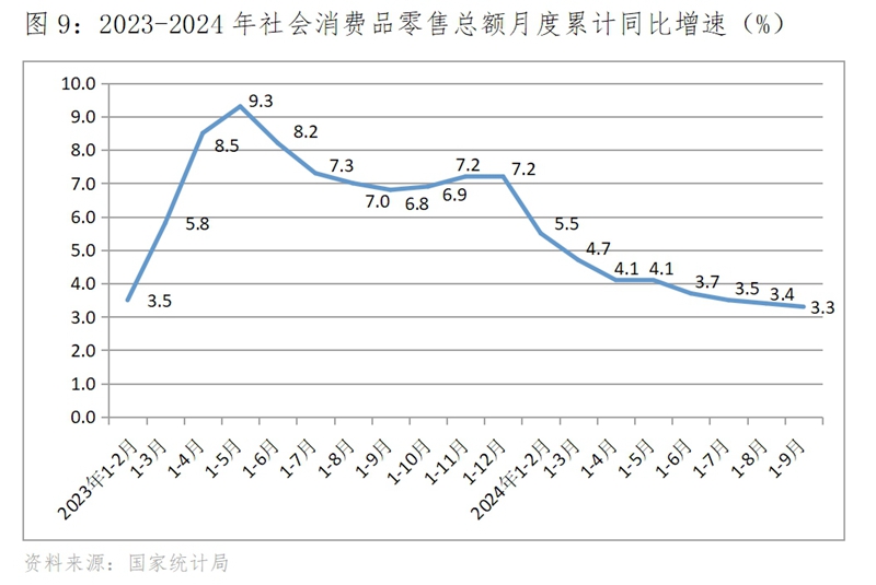 受國內(nèi)需求不足、社會(huì)預(yù)期偏弱以及國內(nèi)外不穩(wěn)定不確定等因素的影響,從月度數(shù)據(jù)增速變化動(dòng)態(tài)看,工業(yè)、投資、零售、出口和財(cái)政支出增速總體呈現(xiàn)出回落的態(tài)勢(shì),整體經(jīng)濟(jì)增長(zhǎng)動(dòng)能在減弱,需要值得關(guān)注的是大部分指標(biāo)增速9月份出現(xiàn)了回升。