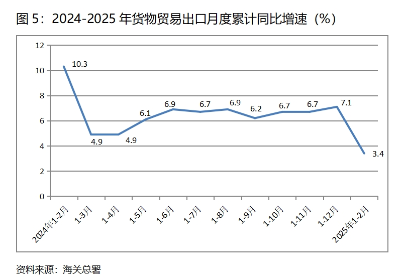 (二)貨物出口增速由升轉(zhuǎn)落。1-2月份,貨物出口同比增長(zhǎng)3.4%,比上年1-12月份增長(zhǎng)7.1%回落3.7個(gè)百分點(diǎn),1-12月份比1-11月份回升0.4個(gè)百分點(diǎn),呈現(xiàn)出增速由升轉(zhuǎn)落的態(tài)勢(shì)。貨物出口對(duì)主要貿(mào)易出口經(jīng)濟(jì)體增速全面回落,1-2月份對(duì)歐盟出口增長(zhǎng)1.8%,比上年1-12月月份回落2.5個(gè)百分點(diǎn);對(duì)美國(guó)出口增長(zhǎng)3.4%,比1-12月份回落2.7個(gè)百分點(diǎn);對(duì)東盟出口增長(zhǎng)6.8%,比1-12月份回落6.6個(gè)百分點(diǎn);對(duì)拉丁美洲出口增長(zhǎng)4.4%,比1-12月份回落10.0個(gè)百分點(diǎn)。