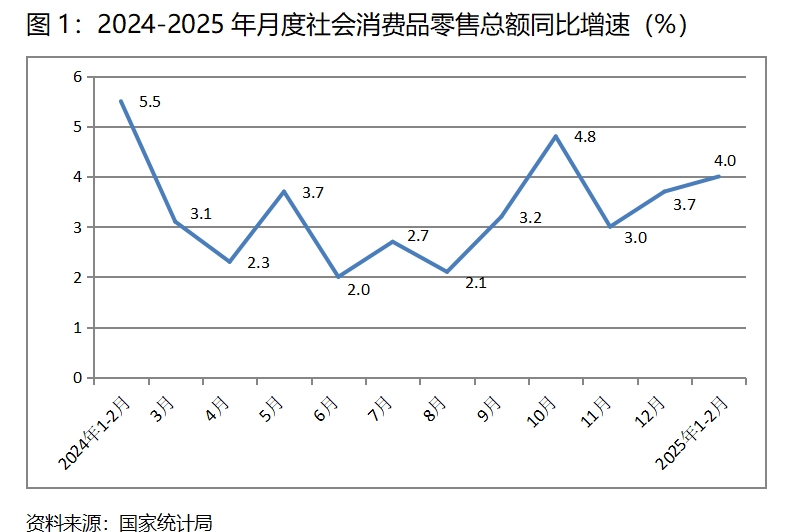 (一)零售增速繼續(xù)回升。1-2月份,社會(huì)消費(fèi)品零售總額同比增長(zhǎng)4.0%,比上年12月份增長(zhǎng)3.7%回升了0.3個(gè)百分點(diǎn),上年12月份比上年11月份增長(zhǎng)3.0%回升了0.7個(gè)百分點(diǎn)。數(shù)據(jù)顯示,社會(huì)消費(fèi)品零售總額保持了持續(xù)回升的勢(shì)頭,這是上年以來采取的以舊換新等系列促進(jìn)消費(fèi)政策措施的結(jié)果,特別需要指出的是,這一增速是在上年同期基數(shù)較高基礎(chǔ)上的回升,更加說明消費(fèi)增長(zhǎng)的動(dòng)力在增強(qiáng)。
