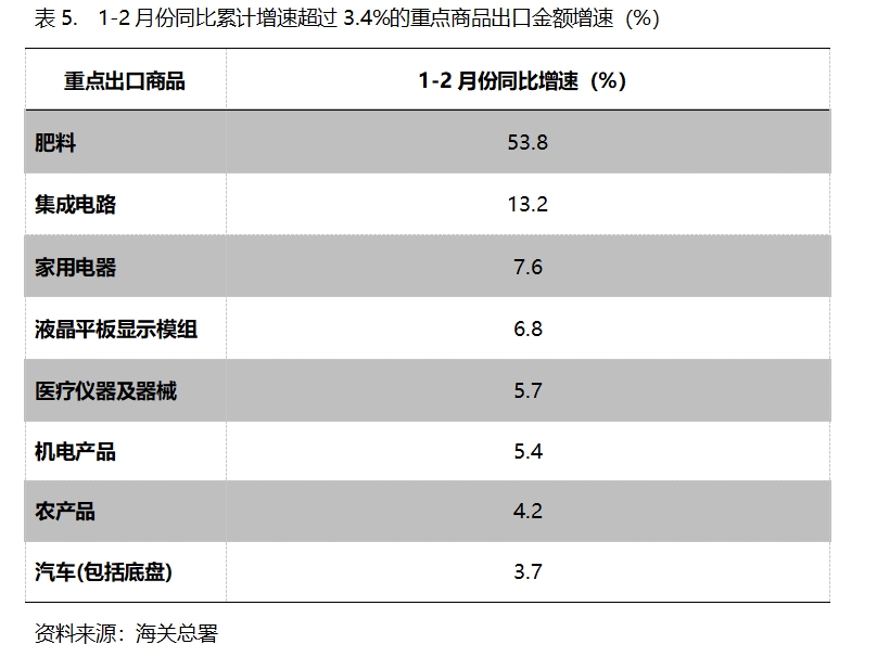 1-2月份,出口金額同比增速超過3.4%的重點(diǎn)商品共有8類,即肥料出口增長(zhǎng)53.8%,集成電路增長(zhǎng)13.2%,家用電器增長(zhǎng)7.6%,液晶平板顯示模組增長(zhǎng)6.8%,醫(yī)療儀器及器械增長(zhǎng)5.7%,機(jī)電產(chǎn)品增長(zhǎng)5.4%,農(nóng)產(chǎn)品增長(zhǎng)4.2%,汽車(包括底盤)增長(zhǎng)3.7%。
