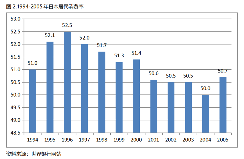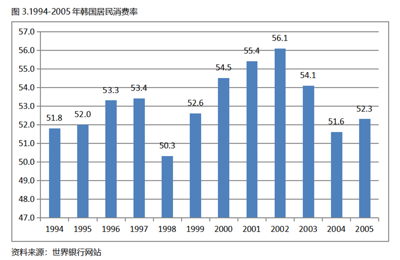 韓國(guó)是1994年人均GDP超過(guò)1萬(wàn)美元的,在1994-2005年的12年期間,居民消費(fèi)率也呈現(xiàn)先升后落的走勢(shì),總體上看是在高位上保持著較為穩(wěn)定的態(tài)勢(shì),2005年比1994升0.5個(gè)百分點(diǎn)。
