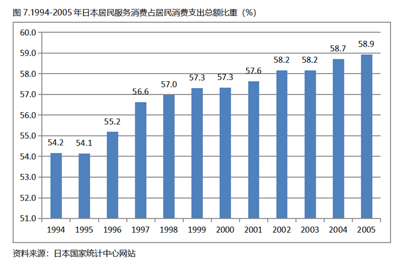 日本在人均GDP超過(guò)1萬(wàn)美元后的1994-2005年期間,居民服務(wù)消費(fèi)占居民消費(fèi)支出總額持續(xù)提高,而居民耐用品消費(fèi)占居民消費(fèi)支出總額比重、非耐用品消費(fèi)占居民消費(fèi)支出總額比重均呈現(xiàn)下降趨勢(shì)。